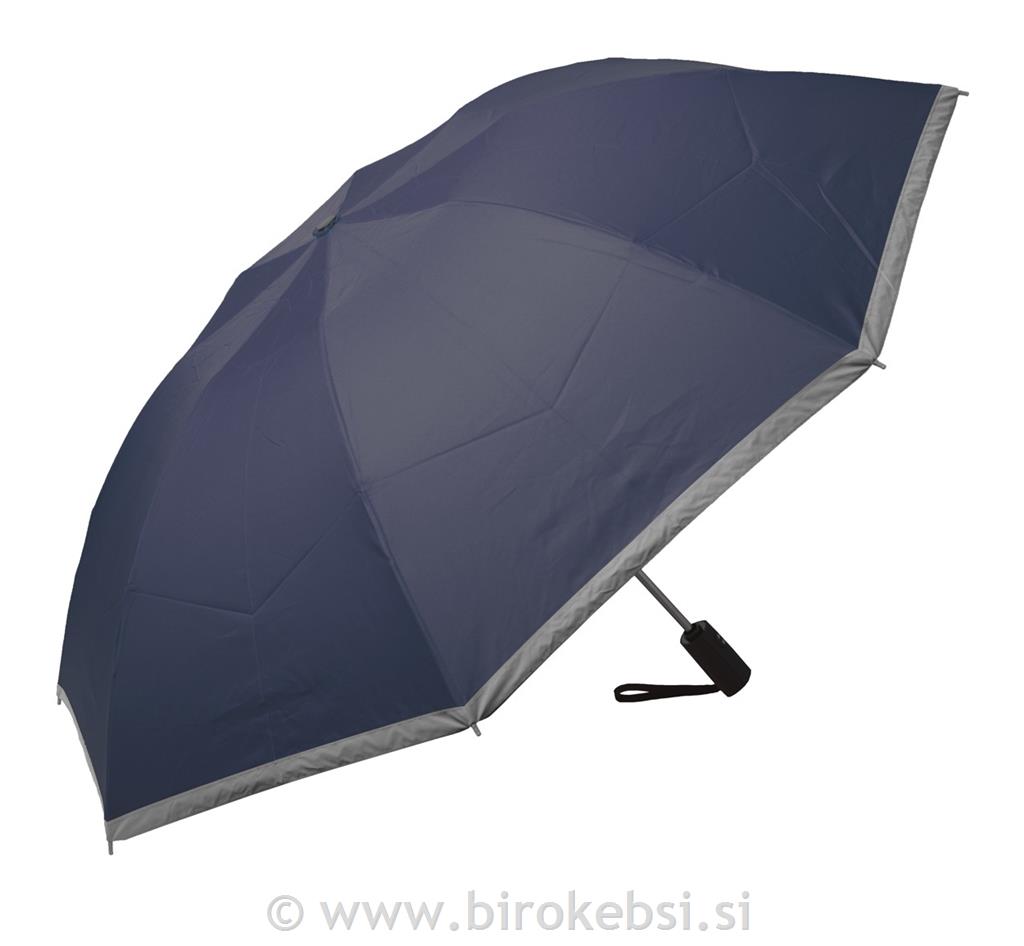 Popolnoma avtomatski (odpiranje/zapiranje), zložljivi dežnik, odporen proti vetru, z 8 paneli in odsevnim robom. S kovinskim ročajem, aluminijastim okvirjem, rebri iz steklenih vlaken in plastičnim ročajem. V torbici ujemajoče se barve z odsevnimi črtami. 190T svilnato-rebrasta koža. Izdelek je namenjen samo promocijski uporabi, ne šteje kot osebna zaščitna oprema.